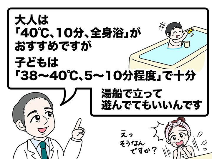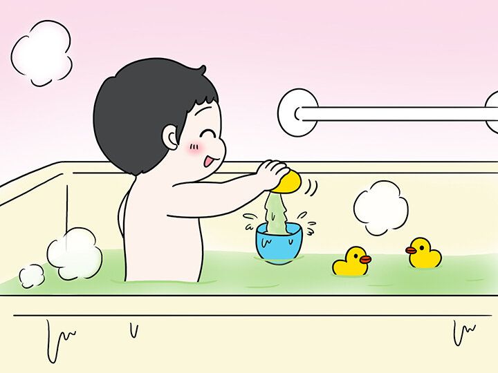 大人は40℃で10分、全身浴がいいとされていますが、子どものお風呂は、38~40℃くらいのやや低めの温度がおすすめ。5~10分程度で、太ももくらいまでつかっていれば体は十分温まります。浴槽に立っておもちゃで遊びながらの入浴でも大丈夫ですよ。体温が上がりすぎたら、子どもは自分からお風呂を出たがります。大人の感覚に無理に合わせようとせず子どもの好む温度やペースに合わせることがとても大事なのです。