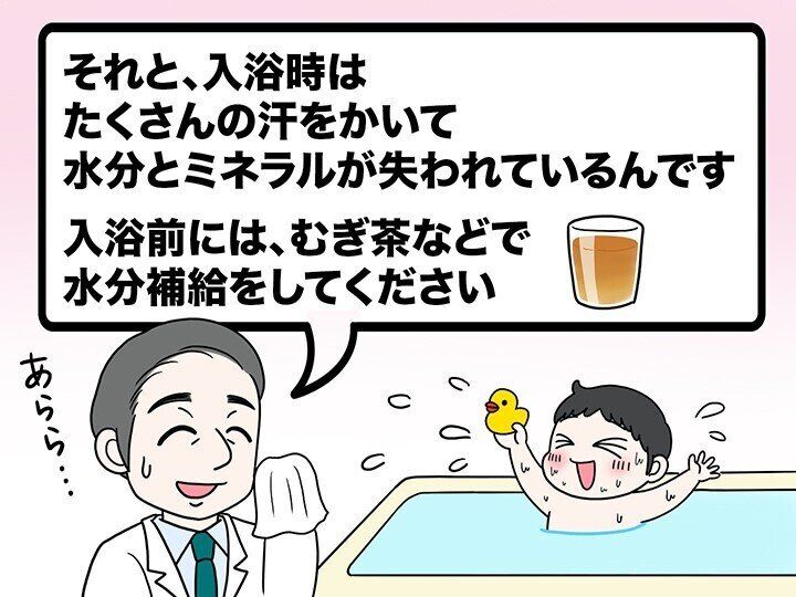 冬は、お風呂に入る前の水分補給が重要です。その理由は、冬は体感温度が低くのどの渇きを感じにくくなるうえ、呼吸や皮膚から気づかないうちに体の水分が失われていく「不感蒸泄(ふかんじょうせつ)」が増加します。コップ1杯(100~200ml)の水分を、入浴の15分くらい前と入浴後に意識して補給することが重要です。汗でミネラルが失われるので、ミネラルが入ったものがいいでしょう。入浴時間が20分を超えるときは、浴室でも飲ませるなどの対策が必要です。
