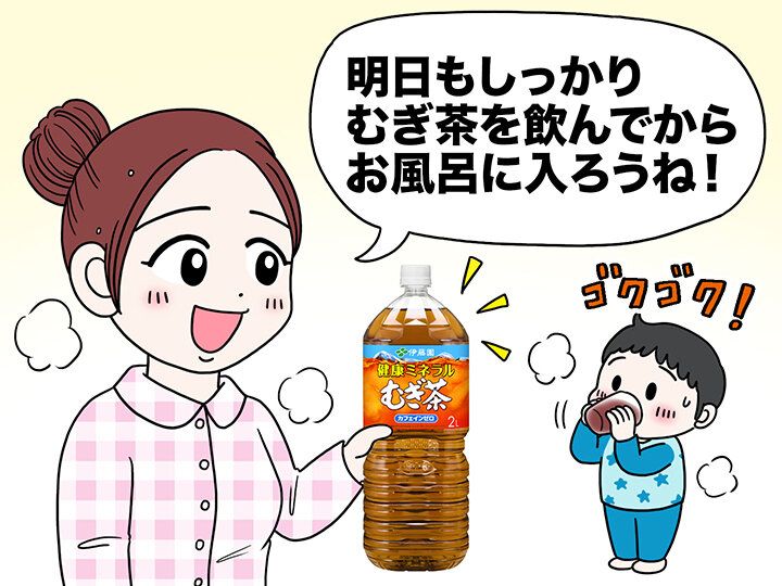 汗をかくと、水分だけではなくミネラルも失われています。ミネラルは5大栄養素の1つですが、体内でつくることができないため、注意が必要です。伊藤園の「健康ミネラルむぎ茶」は、お風呂でかいた汗の水分補給にぴったり。無糖でカロリーゼロ、カフェインゼロだから、家族みんなでゴクゴク飲めます。冬は常温やホットでもおすすめです。
