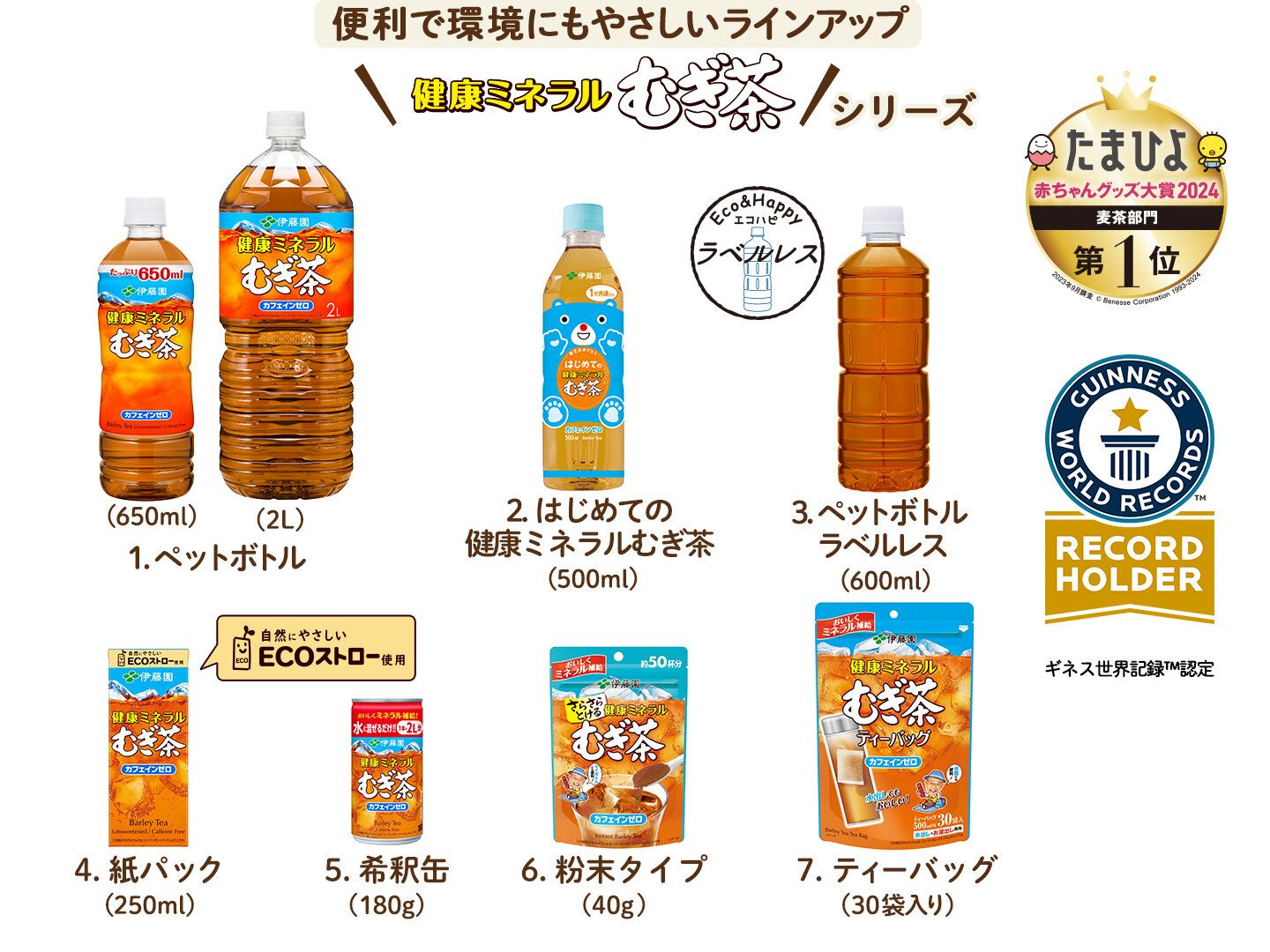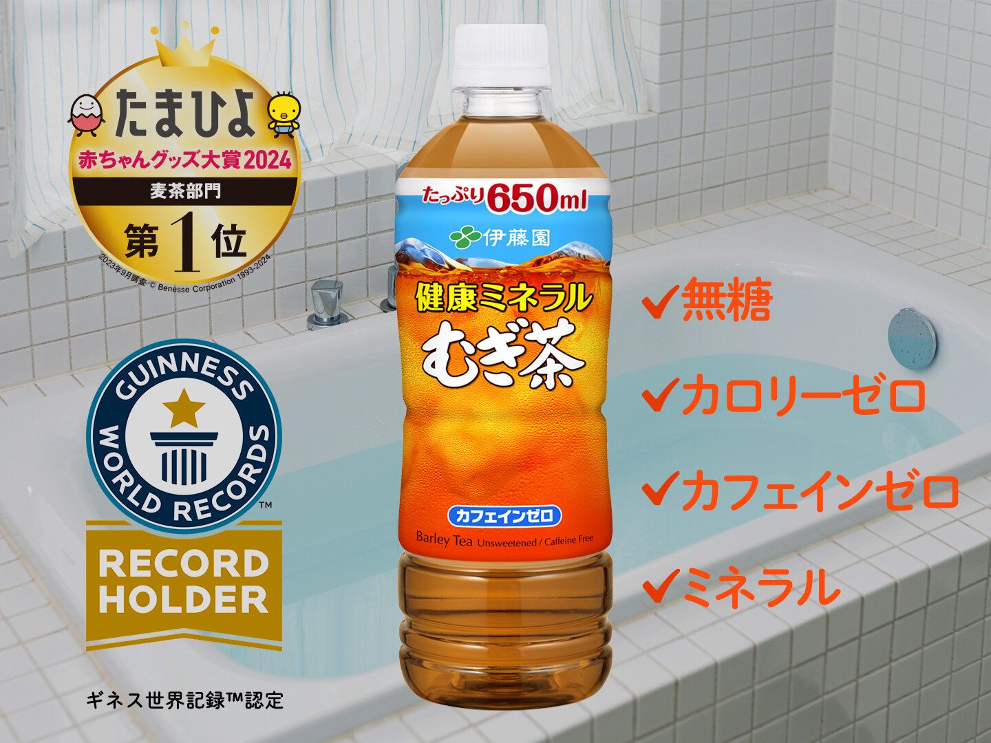 伊藤園の「健康ミネラルむぎ茶」は、多くのママに支持されて、「たまひよ赤ちゃんグッズ大賞」麦茶部門で部門創設時から9年連続受賞を果たしています。また、食品中の放射性物質の基準値については、厚生労働省が設けている乳児用規格適用食品(※1)と同等の管理を実施しています。だから、赤ちゃんから大人まで、家族みんなで毎日ゴクゴク飲めます! そのおいしさは日本はもちろんのこと、世界でも認められ、麦茶飲料販売実績日本(※2)、世界NO.1(※3)ギネス世界記録™に認定されました。