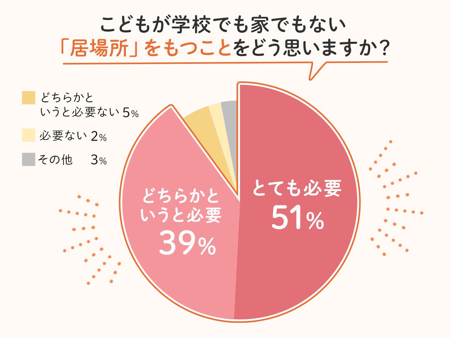 臼井 サンキュ!とたまひよの合同アンケート調査で以前、「こどもが家庭でも学校でも塾でもない、安心して過ごせる居場所をもつことをどう思いますか?」と聞きました。「とても必要」は51%、「どちらかというと必要」は39%。9割以上の親が居場所づくりを肯定的に捉えていました。
