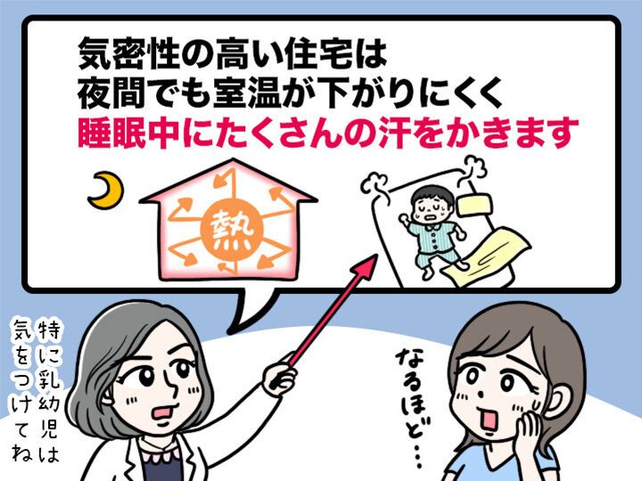 さらに、日中の日差しで家の壁や天井には熱が蓄えられ、夜には放射熱となって室内に流れ込むため、室温は下がりにくくなります。睡眠中には大量の汗をかいてしまいますよね。