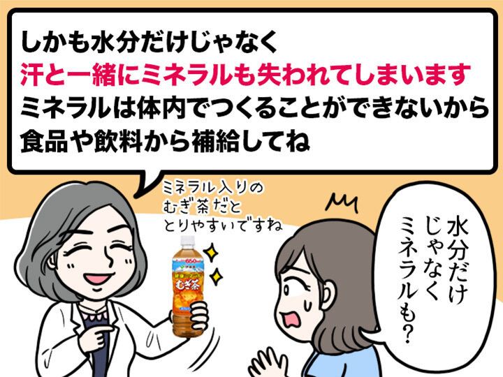 そもそも水分・ミネラル補給はなぜ大事なのでしょうか…。汗をかくと、水分だけでなく、体に必要な栄養素であるミネラルも失われてしまいます。その結果、体内の水分・ミネラルバランスが崩れ、自律神経の乱れにつながる体温調節機能も乱れてしまい、体内に熱がこもって体調が崩れてしまうのです。体温調節がまだ上手でない乳幼児や水分を貯めておく筋肉量の少ない女性などは、特に注意が必要です。