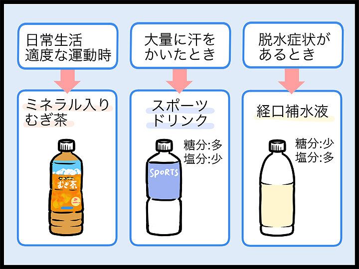 水分補給のための飲料といっても種類はさまざま。体調に合わせて飲料を選ぶことが大切です。