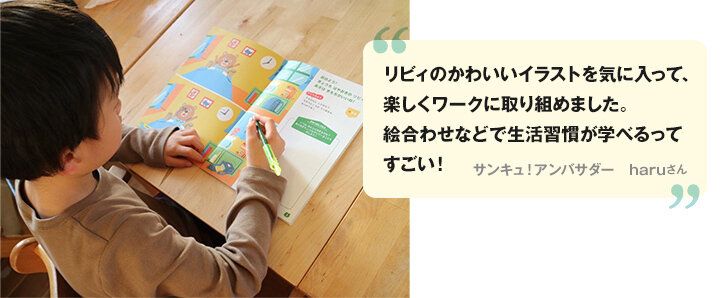 「まさに今、家探し、土地探しをしています。夫は仕事が忙しく、基本的に私にお任せなのですが、今回3冊を家族みんなで読んで『こういう住宅ワークスペースがあったらもう少し家で仕事ができるかも』と初めて意見を。子どもも『リビィのおうちじかん』に楽しく取り組んでいて、『お魚が好きだからもっと食べたい』など私が知らなかったもいっぱい。新たな発見がありました。家はつい見た目のおしゃれさや広さなどに目がいきがちですが、暮らす上での収納のしやすさや子どもが自分で生活習慣を整えられるような空間づくりを考えていきたいと思いました」