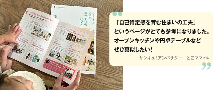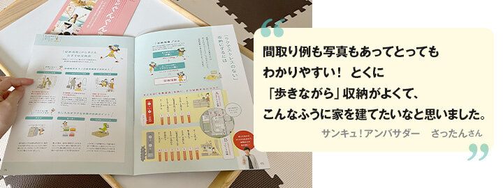 「二人目の子どもが生まれたこともあり、上の子が小学校に上がる前に家を建てたいと考えて、モデルハウスをまわっているところです。今回の冊子は、間取りや収納について家族で具体的に話すきっかけになりました。『片づく家づくりのヒント』は間取りや写真がとてもわかりやすく、『子どもがぐんぐん伸びる家』は暮らしの中に学びのきっかけがあること、気づきのある空間づくりが具体的に知れてわくわくしました。『リビィのおうち時間』は親にとっても学びになりました」
