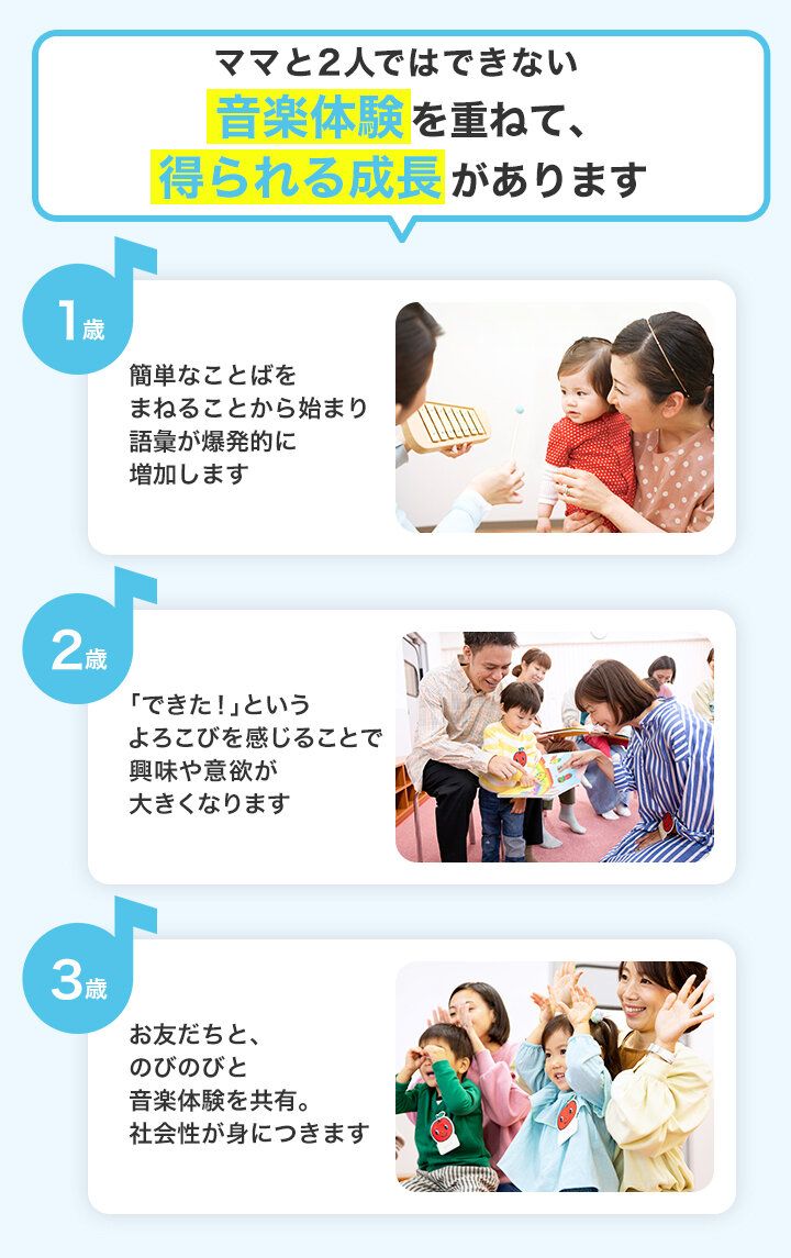 ヤマハ音楽教室には、1~3歳のお子さんを対象にした「ドレミらんど」というコースがあります。多彩な音楽体験を重ねることで感性や情緒を育み、子ども一人ひとりの成長に寄り添うレッスンです。1~3歳児の発達特性をさまざまな視点で研究し続けてきたヤマハだからできるレッスン。質の高い本物の音楽に触れ、ママも子どもも癒されながら、お子さまの音楽への興味や、好きという気持ち、また社会性等を身につけていきます。
