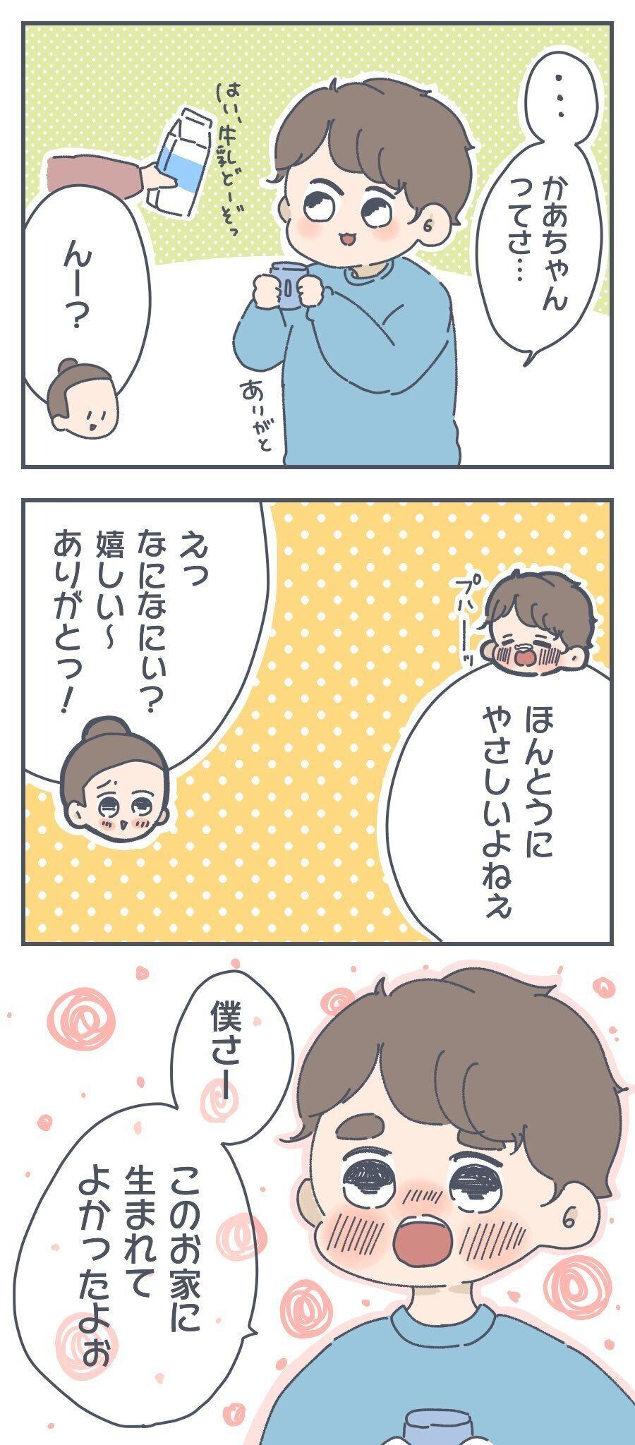 おまめくんの「このおうちに生まれてよかった」という言葉に、「なんでもない普通の日に唐突に……育児歴6年で聞けるとは思ってませんでしたね……」とコメントしたおかめさん。これは泣いてしまいます!