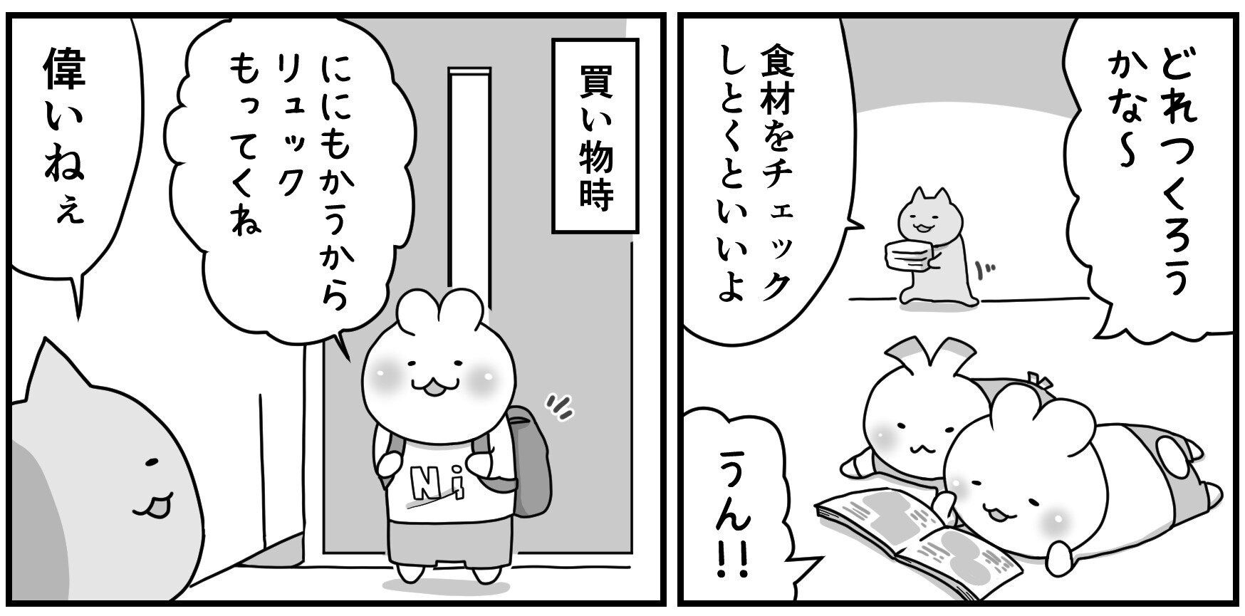 さっそくレシピ本を読むににくん。食材の買い出しに出かけようとリュックを背負い、やる気まんまんの様子です。