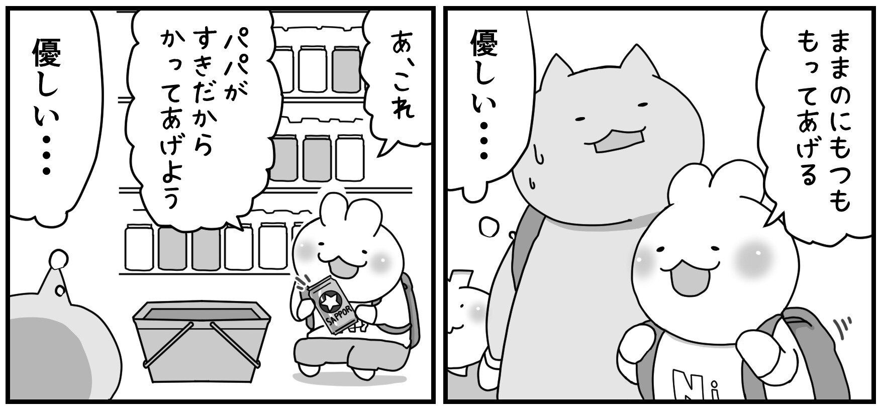 ににくんはママの荷物を持ってあげたり、お店でパパが好きなものを選んであげたりもしています。