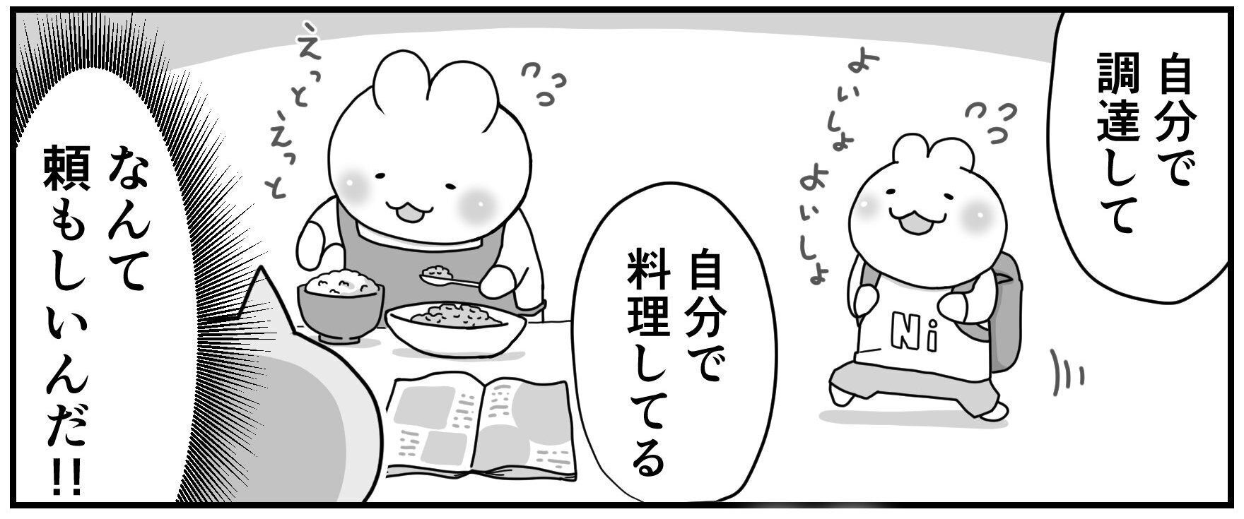 自分で食材を調達したににくんは、さっそくレシピ本を見ながら料理を始めました。