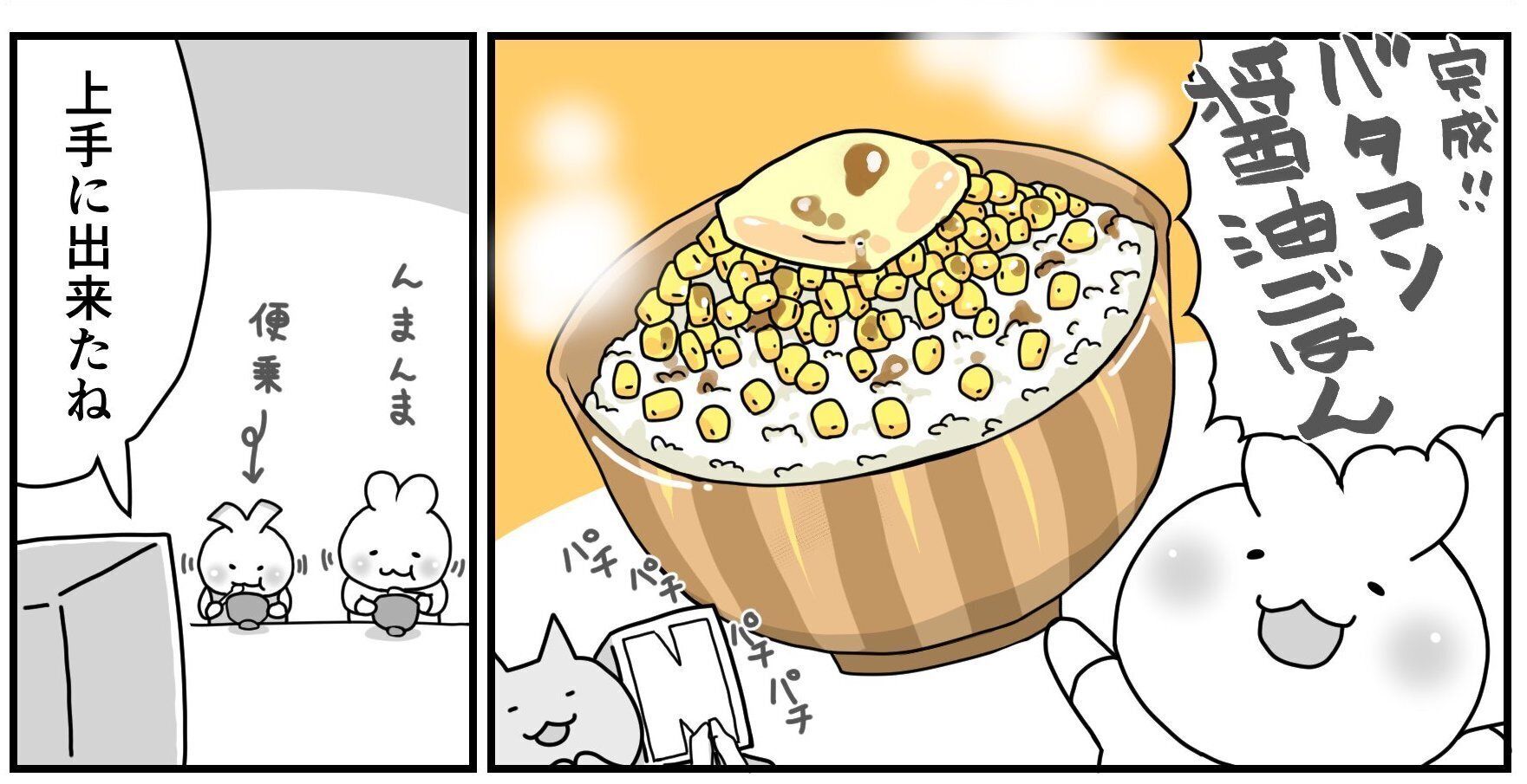 やがて「バタコン醤油ごはん」という料理が完成!パパ頭さんは「上手にできたね」と褒めます。