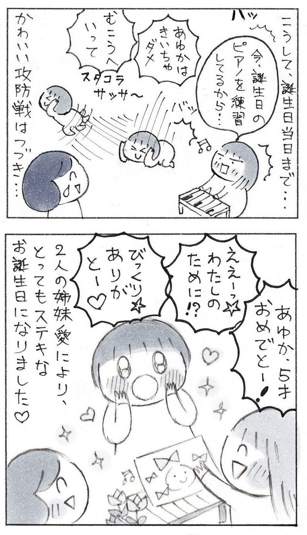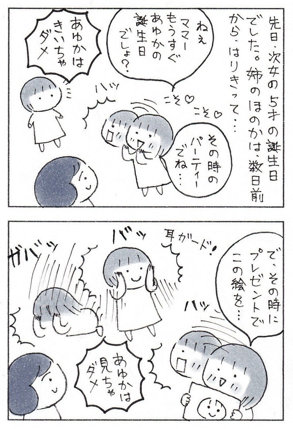 妹の誕生日を目前にして、誕生日会の企画をするお姉ちゃん。サプライズにしたいお姉ちゃんはママにこっそり相談をしますが、気がつくといつも妹の姿が……