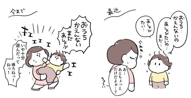 遊びに出てまだ帰りたくないときには「おうちかえんない。まだあしょぶ」とさわぐ息子さんを、必死に抱えて「帰ろう!ね!」と説得するママという図式でした。