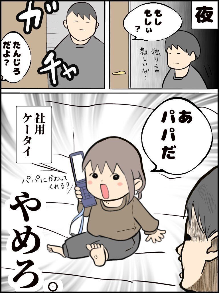 なんと、会社用のガラケーで会社の人と話しているお子さんの姿!ショックな気持ちが、ゆーぱぱさんの横顔から伝わってきます。