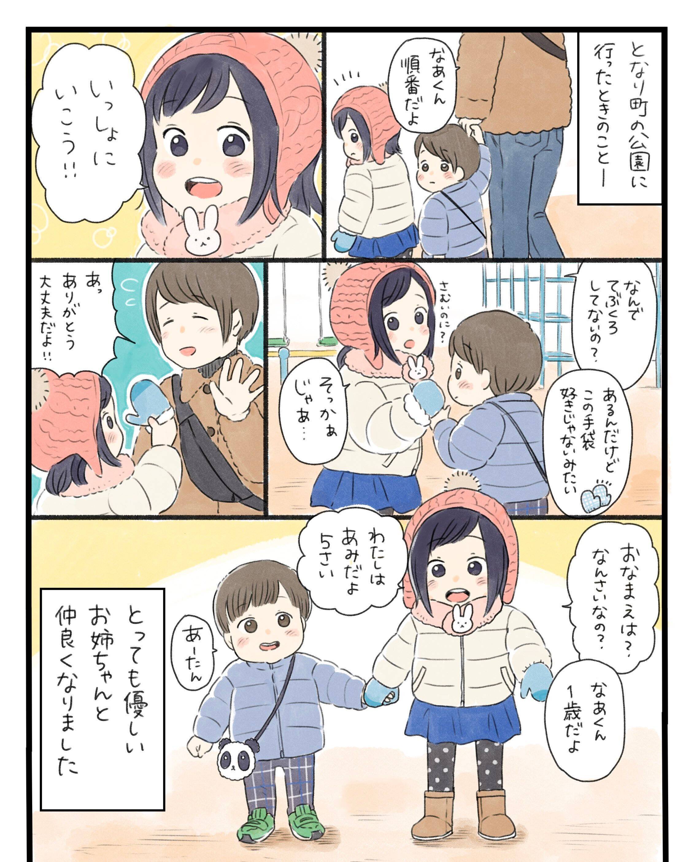 みや子さんは、1歳の息子くん・なあくんととなり町の公園へ遊びに行きました。漫画は、そのときに出会ったあみちゃんとのエピソードです。