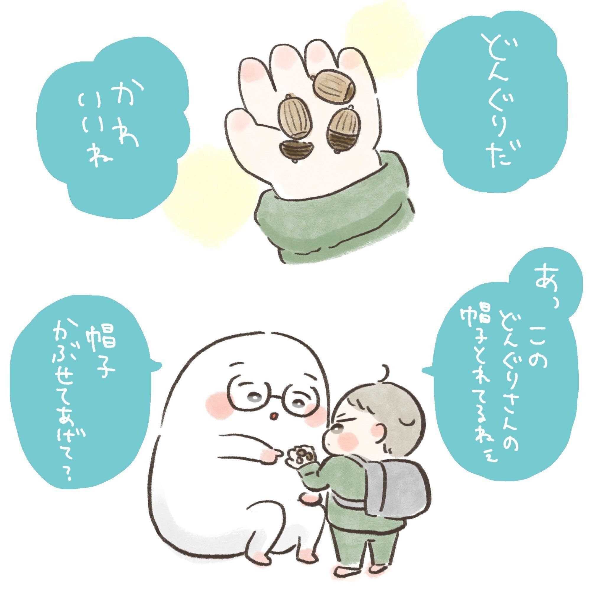 ママへのおみやげをよく持ち帰るさんくん。その日のおみやげはどんぐりでした。そのなかに、どんぐりの帽子が取れているものがあります。「帽子をかぶせてあげて」と言うchiさん。