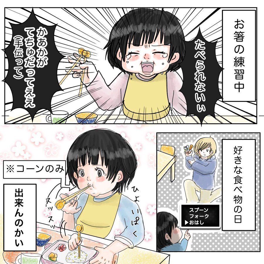 お箸を器用に使い、大好きなコーンをつまんで食べるお子さんの様子に、にっこりしてしまう漫画でした。子どもたちのがんばりを見守れる心を余裕をもって日々過ごしていきたいものですね。