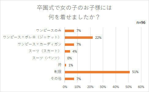 女の子の場合、卒園式では制服が51%。制服がない場合はワンピース×ボレロが22%、ワンピースのみとワンピース×カーディガンが7%となりました。