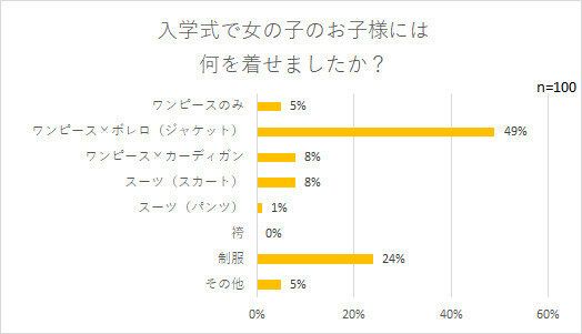 小学校の入学式では、ワンピース×ボレロが49%と約半数。次いで制服24%、ワンピース×カーディガン、スーツ(スカート)が8%になりました。形も色柄もたくさんそろっているワンピース×ボレロの組み合わせは圧倒的に人気でした。