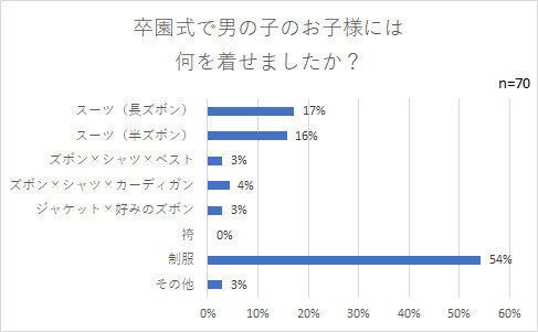 男の子の卒園式の服について聞いたところ54%の過半数が制服と回答しました。制服のある園では制服になりますが、私服の園では長ズボンのスーツ(17%)半ズボンのスーツ(16%)となっています。ベストやカーディガンという比較的カジュアルな服装よりはスーツを選ぶ人が多いようです。