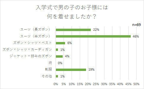 小学校の入学式では、男の子は半ズボンスーツ派が46%と最多。次いで長ズボンスーツが22%となっており、7割ほどの子どもがスーツを着て入学式に出席するようです。