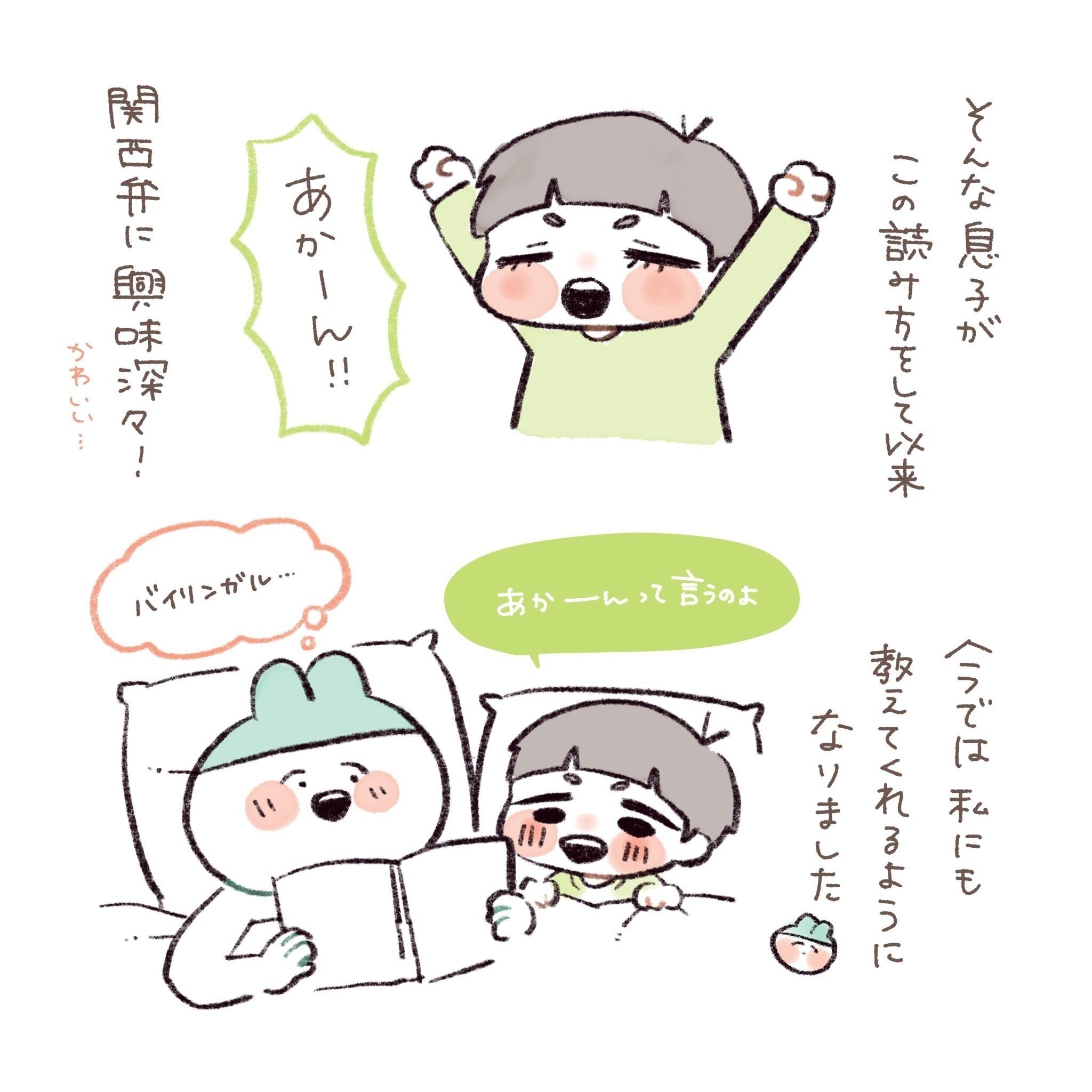 漫画のなかの「バイリンガル……」という部分には思わず笑ってしまいました。標準語と関西弁のバイリンガル!?の息子さんは、関西弁がどのくらい上達しているのか気になりますが……