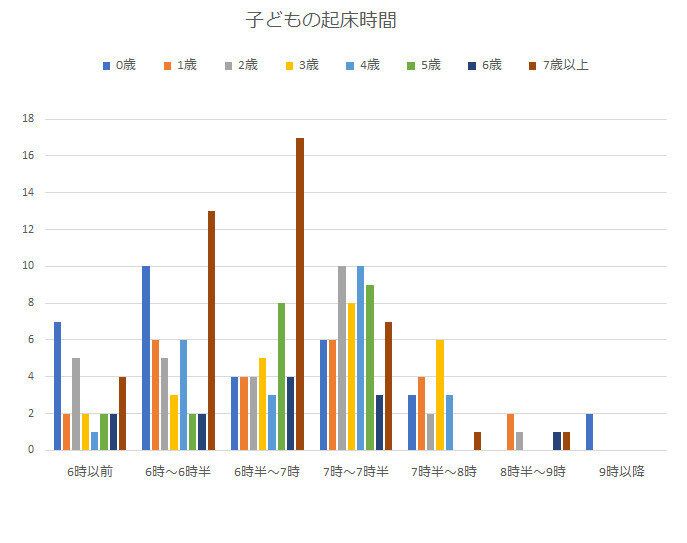 起床時間を見ると、0歳は6時~6時半、2歳から5歳までは7時~7時半、7歳以上は6時半~7時が最多でした。