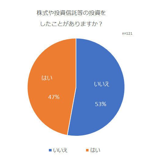 株式や投資信託等の投資をしたことがありますか?という質問では、投資をしたことがある方は約半数という結果になりました。