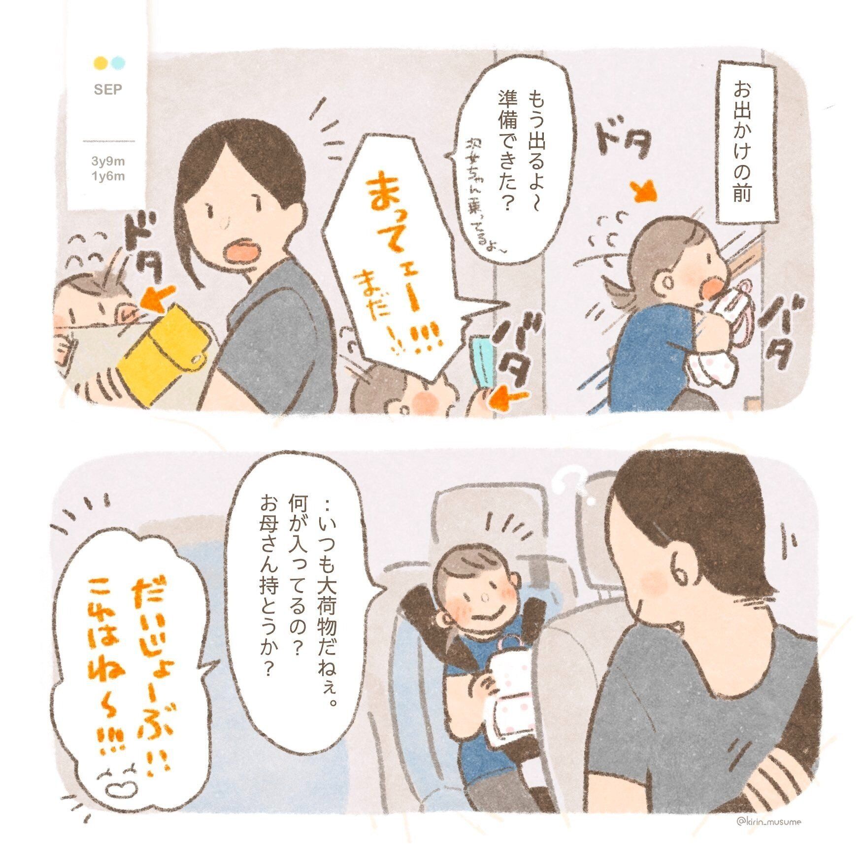 漫画のなかで、きりんさんは「いつも大荷物だね」と言っていますね。長女ちゃんはいつも、次女ちゃんの荷物を準備しているのでしょうか。