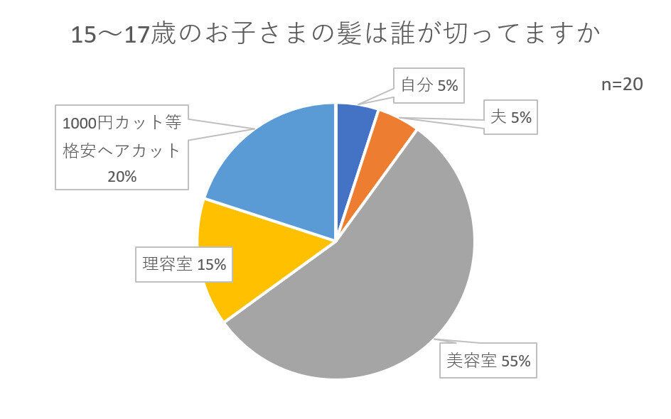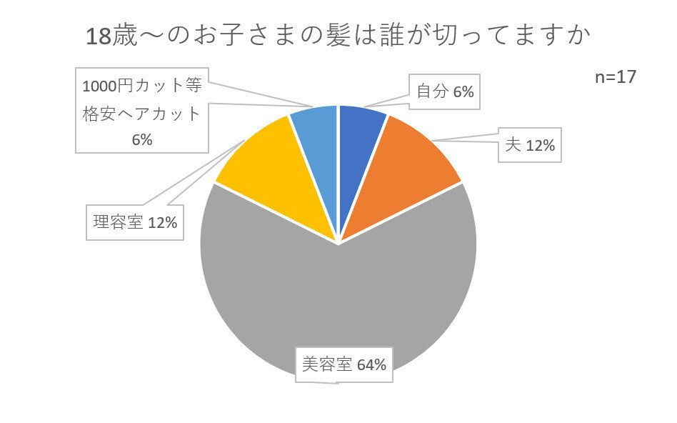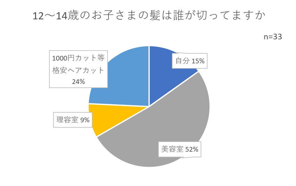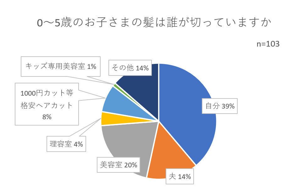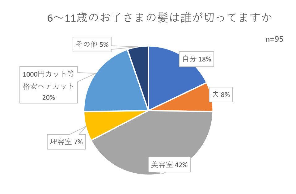 美容室・理容室・格安ヘアカットなどのお店で切っている子は合計32%と、比較的少ない結果でした。