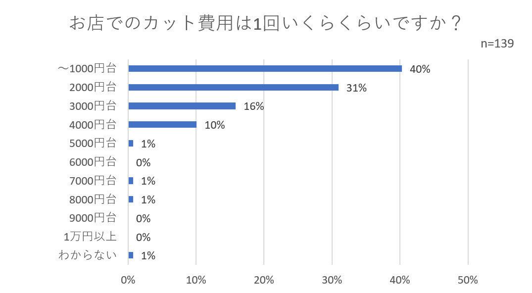 お店でのカット費用は1,000円台が4割、2,000円台が約3割と多数派です。とくに14歳以下ではその傾向が強いようでした。