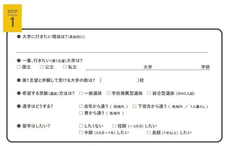 書くことで押さえるべきポイントが分かり、考えを整理できます。進路に迷う場合は、進学先ごとにシートを書いてみても。
