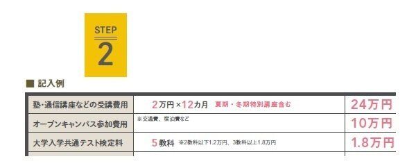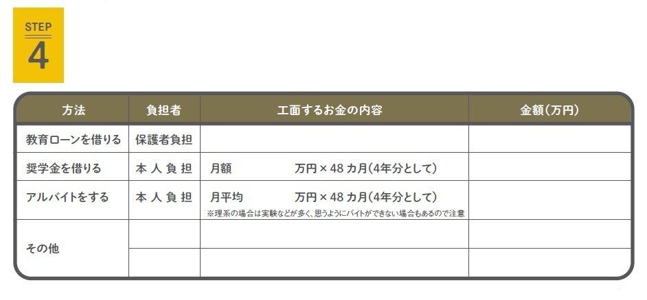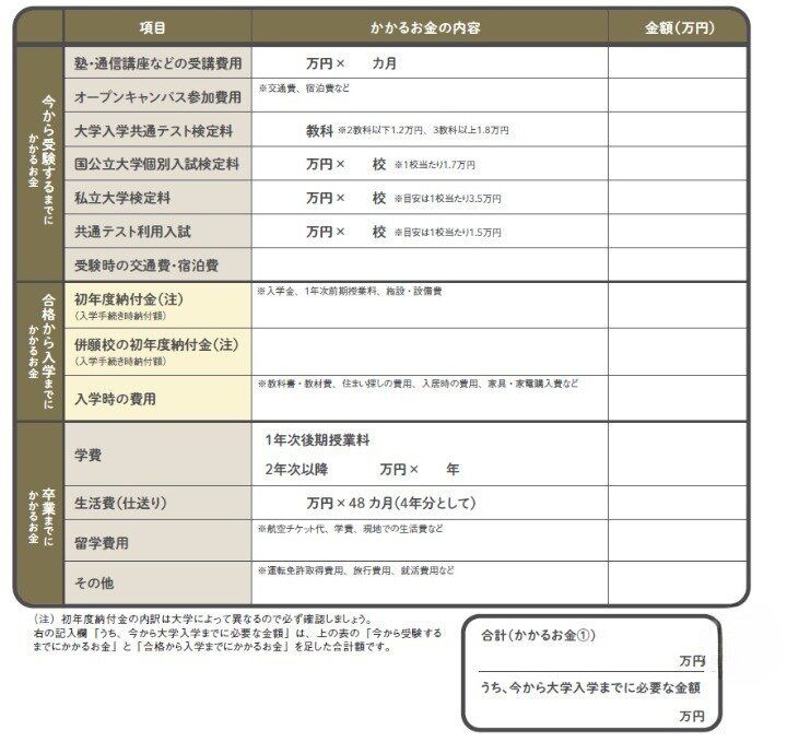 受験から大学卒業までにかかる費用を調べて、必要な額を書きましょう。志望校によって金額に差がある場合は、金額が高い方で見積もると◎。