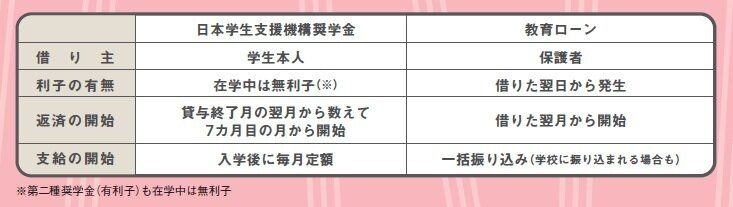 奨学金は子ども、教育ローンは親が借り主となり、支給や返済の仕方にも大きな違いが。奨学金は入学後に支給されるので、入学前に必要なお金については教育ローンでの準備を検討しても。