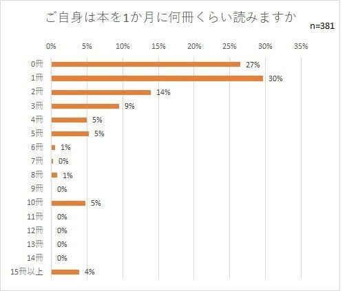 親自身は本を1カ月に何冊くらい読むか聞いたところ、1冊が30%、0冊が27%と多数派でした。しかし、なかには月に10冊以上読んでいる人もいるよう。