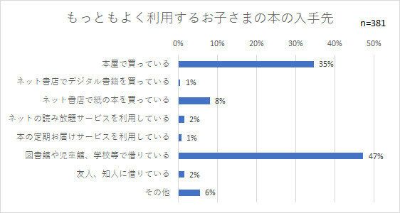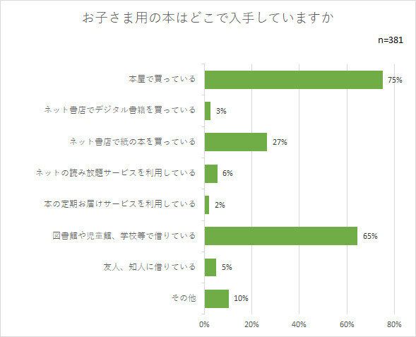 本を入手する場所を聞くと、「本屋で買っている」「図書館や児童館、学校等で借りている」との回答が圧倒的。