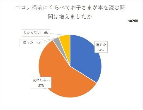 コロナ前に比べ、子どもの読書時間は変わらないと答えた人が57%でしたが、増えたと答えた人も34%と多くいました。