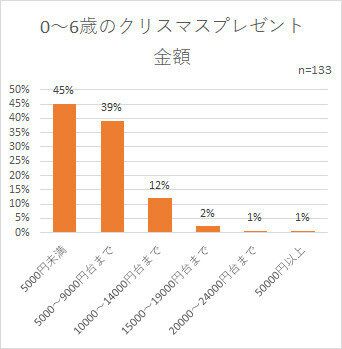 年齢別にプレゼントの金額を聞いてみると、0~6歳までは45%の人が5000円未満と答えています。次いで5000円~9000円台が39%と、年長さんくらいの子どもがリクエストするものはだんだんと値がはるものがふえてくるのかもしれません。
