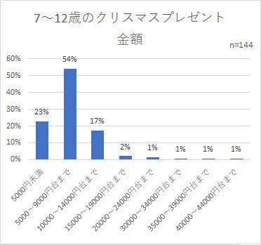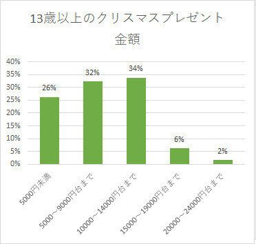 13歳以上になると金額が分散してきますが、10000~14000円までが最多の34%と、1万円を超えるプレゼントをあげる人が多くなっています。