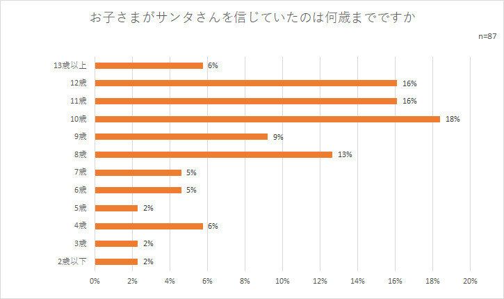 8歳までサンタクロース信じていたと回答したのが13%となり、この年齢を境にサンタクロースを信じない子どもが急速に増えていき、小学校を卒業するころまでにはほとんどの子どもが真実を認識するようです。