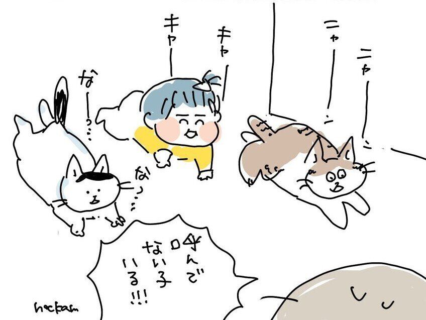 猫たちと同じ目線で向かってくる姿は、なんともかわいらしいですね。