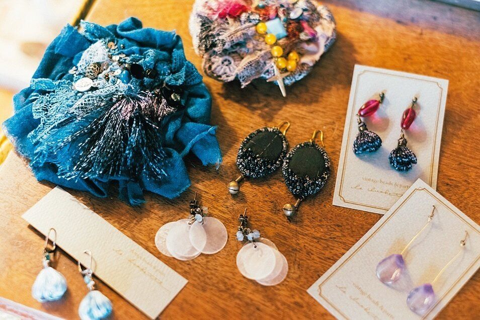 ビンテージのレースやビーズなどと、大島紬の端切れや糸を組み合わせて、盛さんが作ったアクセサリー。「島の自然からイメージを広げています」。
