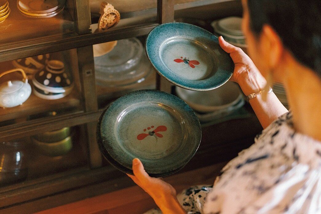手にしている器は島で作陶されていた方の作品。でも、その他の器のほとんどは作家の名前も知らない物ばかり。ただ好きな物だけ選んでいます。