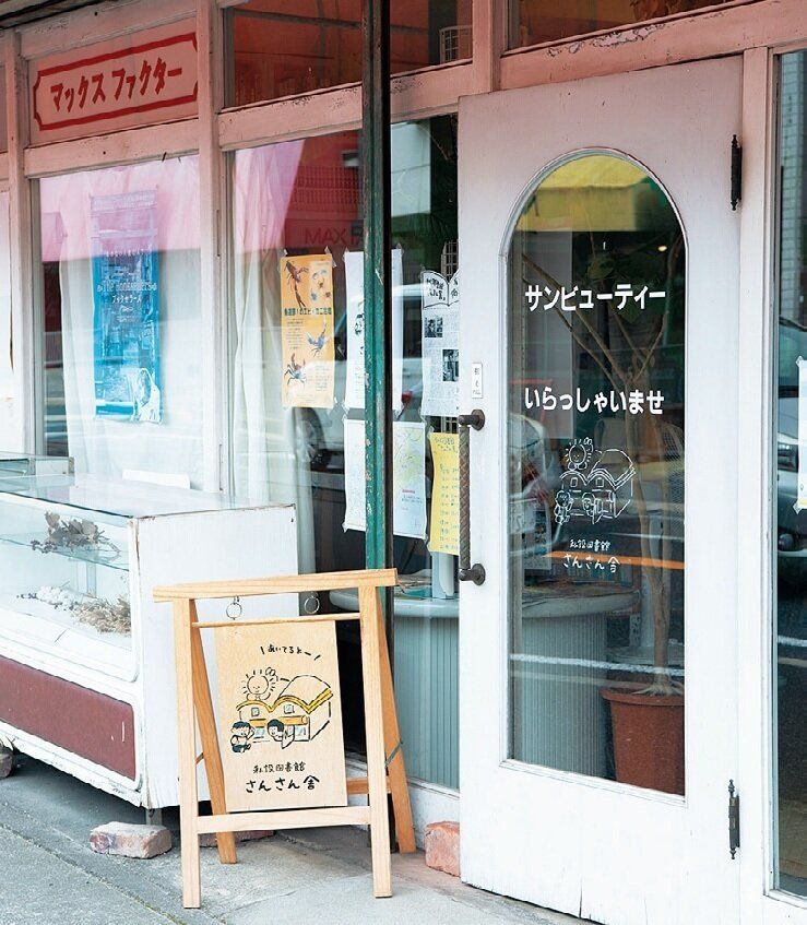 「シャッターがずっと閉まっていたから知らなかったんですが、中に入ったら化粧品用の棚がたくさんあって。本を並べるにはピッタリ。やるしかない!」と決断した瀬戸さんがつくったのが、仲間の蔵書を持ち寄った私設図書館「さんさん舎」。大人も子どもも無料で立ち寄れ、のんびりと本やまんがを読める場所です。