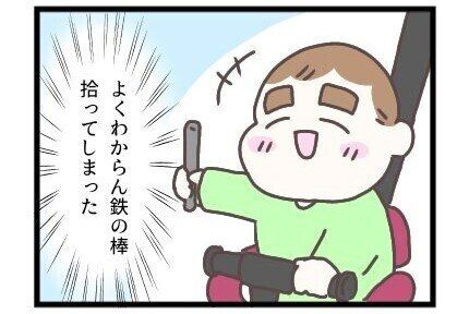 息子さんは道端に落ちていた、よく分からない鉄の棒を拾ってしまいます。