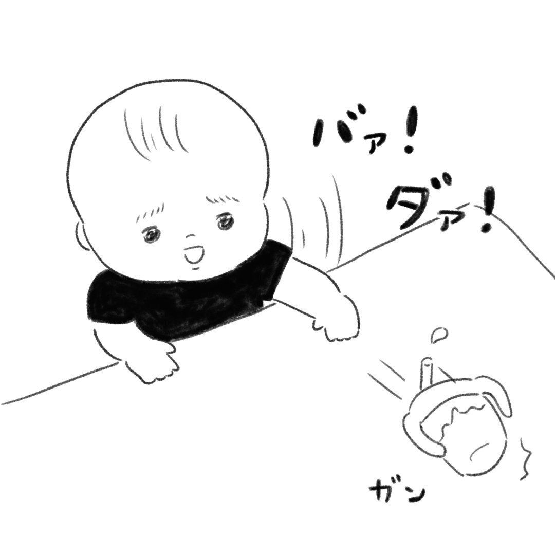 1歳のこじろうくん。マグを思い切り投げてしまいます。