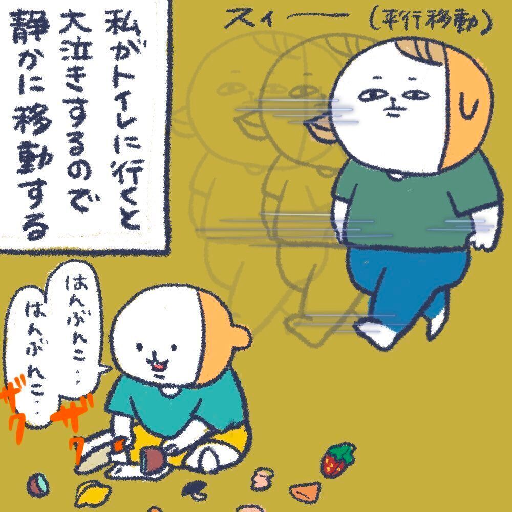 トイレに行くと、こうどんくんが大泣きするとわかっているおうどんさん。こうどんくんにばれないように平行移動し、トイレへと向かいます。