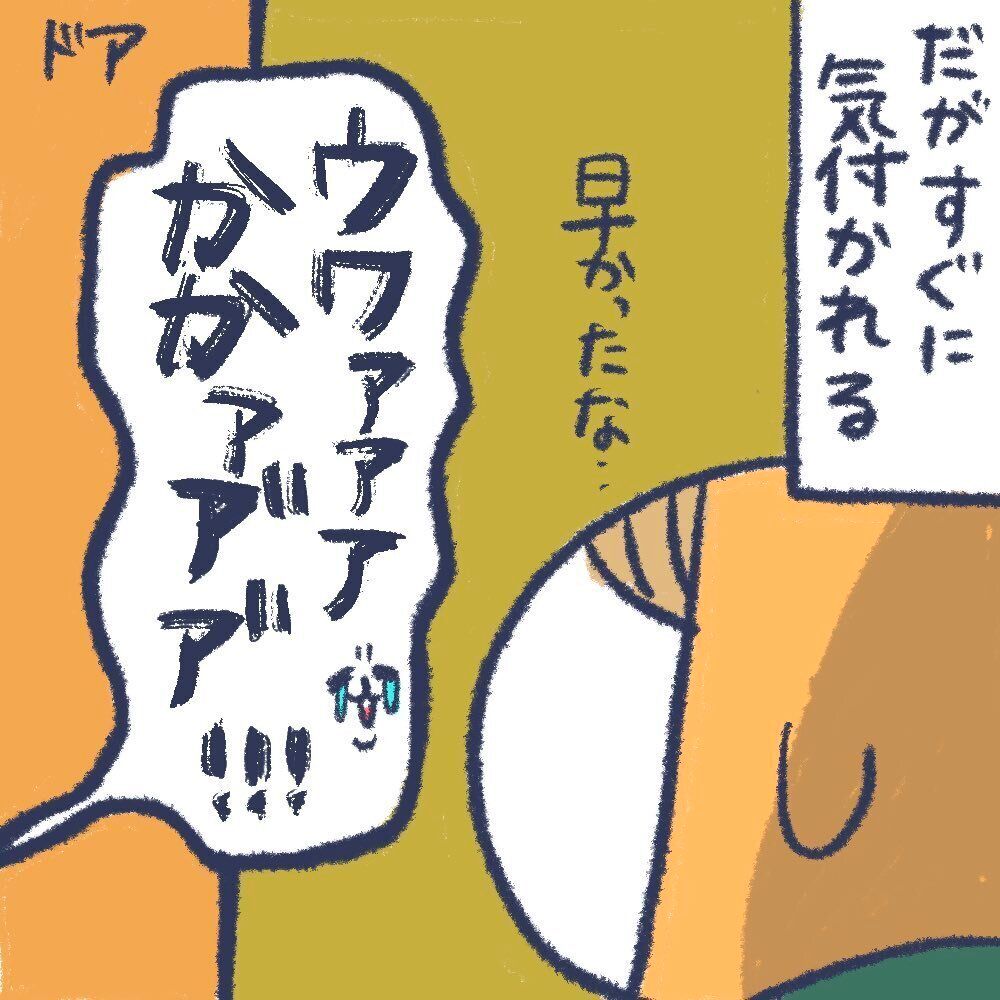 しかし、努力も虚しくすぐに気づかれてしまいました。トイレの外から大泣きする声が聞こえてきます。