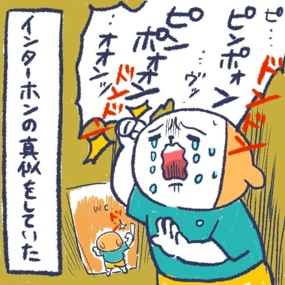 「ぴんぽーんは健在です。ですが、私が『ごめんねー今トイレだから待っていてね』と言うと諦めたのかスンっと泣きやみ、とぼとぼリビングに戻っていきます。それはそれで少し寂しいです……」